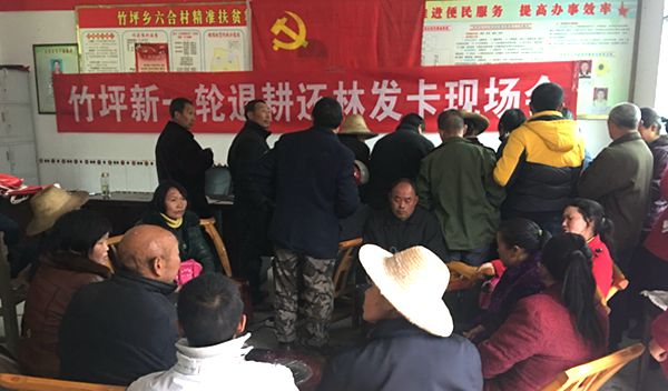 3月23日,竹坪乡六合村95户退耕农户在村委会高兴地领到2015年新一轮退耕还林补助款银行卡。